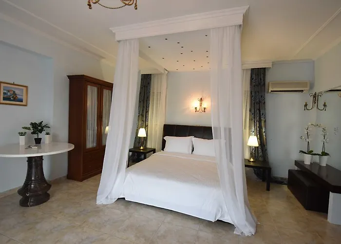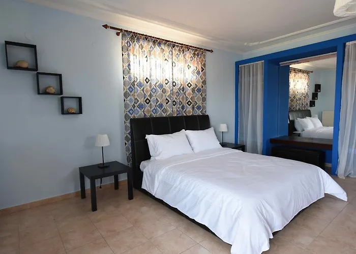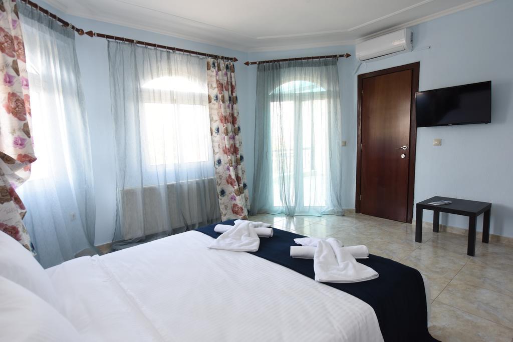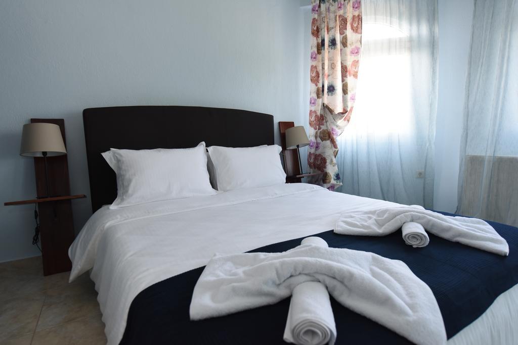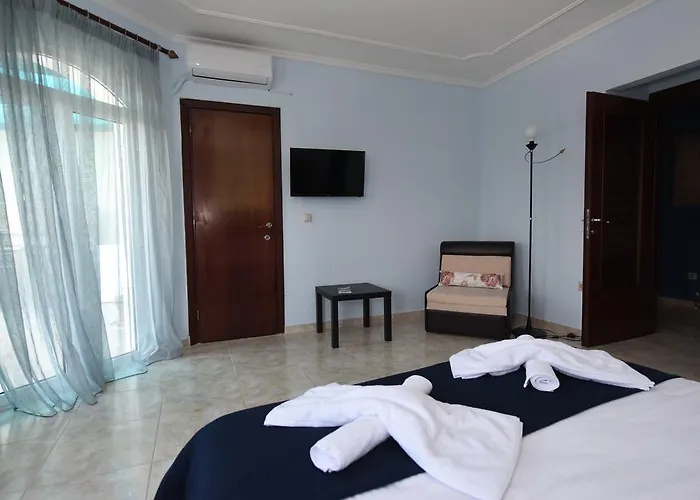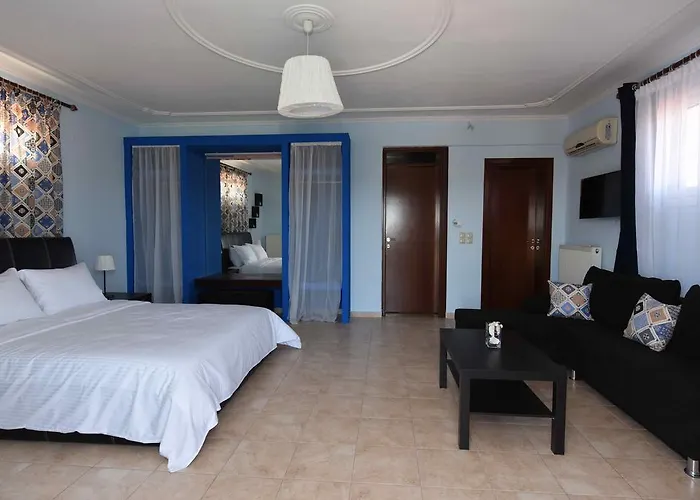 Studio 1/2 Alkioni se nalazi na prizemlju, ima francuski ležaj i kuhinju,kupatilo sa tuš kabinom, za maksimalno dve osobe. Studio 1/2 Dimitra se nalazi na prizemlju, ima francuski ležaj, a kuhinja je na terasi, kupatilo sa tuš kabinom, za maksimalno dve odrasle osobe. Studio 1/3 Dafni se nalazi na prvom spratu, ima francuski ležaj i singl ležaj, kuhinja je na terasi, kupatilo je sa tuš kabinom, za maksimalno tri odrasle osobe i jedno dete do 3 godine. Apartman 1/4 Nireas se nalazi na prizemlju, ima u spavaćoj sobi francuski ležaj, a u kuhinji kauč na razvlačenje i jedan singl ležaj, kupatilo je sa tuš kabinom, za maksimalno četiri odrasle osobe i jedno dete do 6 godina. Apartman 1/4 Afroditi se nalazi na prvom spratu, u spavaćoj sobi ima dva singl ležaja, u drugoj sobi ima francuski ležaj, kuhinja se nalazi na terasi, kupatilo je sa tuš kabinom i kadom, za maksimalno četiri odrasle osobe i jedno dete do 6 godina. Apartman 1/4+1 Iris se nalazi na drugom spratu, ima u spavaćoj sobi jedan francuski ležaj i ugaonu garnituru, a u kuhinji se nalazi jedan kauč na ravlačenje, kupatilo je sa kadom, za maksimalno četiri odrasle osobe i jedno dete do 12 godina. Duplex 1/8 Apollon se nalazi na prvom spratu, veoma je prostran, pogodan je i za dve porodice. U prvoj spavaćoj sobi se nalazi jedan francuski ležaj, jedan singl ležaj i kauč, u drugoj spavaćoj sobi se nalazi francuski ležaj, a u dnevnom boravku se nalaze kauč i fotelja na ravlačenje. Poseduje kuhinju sa trpezarijom, kupatilo sa tuš kabinom i veliku terasu i sve to za maksimalno osam odraslih osoba i dvoje dece do 6 godina. Sve smeštajne jedinice imaju LCD televizore sa satelitskim kanalima i interenet. Ostale udobnosti uključuju pribor za pripremu čaja, frižider i rerna za samostalnu pripremu hrane. Sa bideom, kadom i tušem, kupatila takođe imaju fen za kosu. Promena posteljine je jednom u toku smene, gosti sami odrzavaju higijenu.